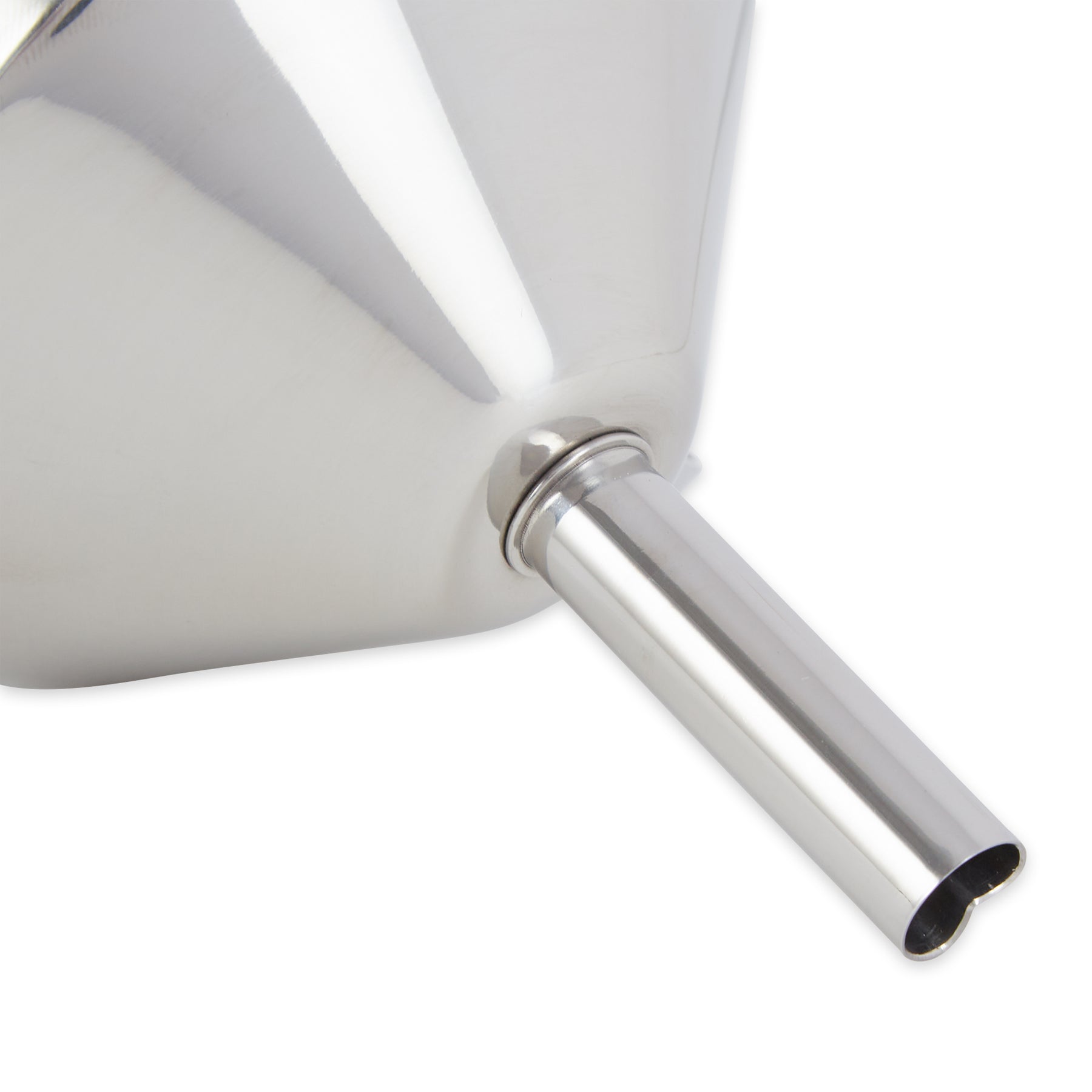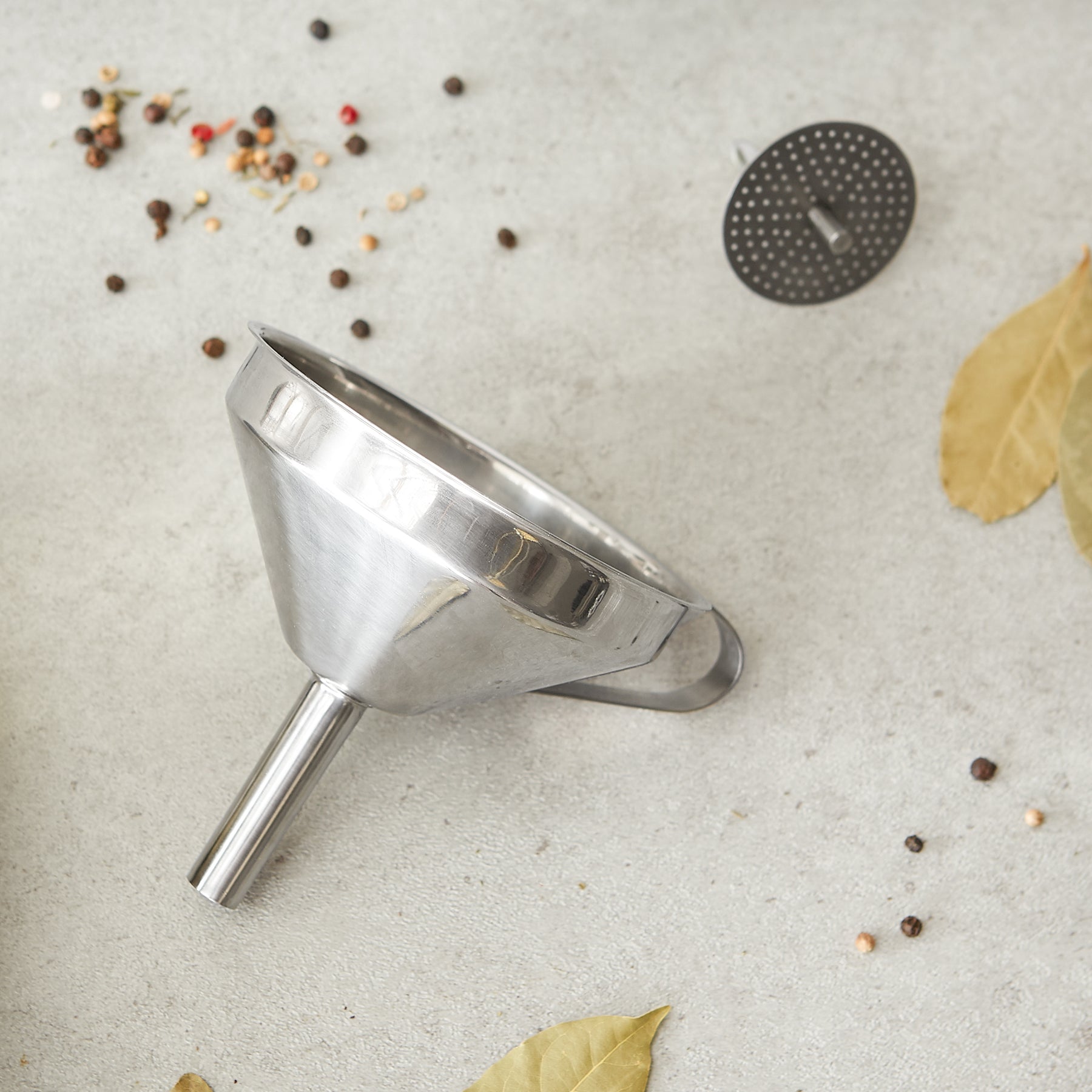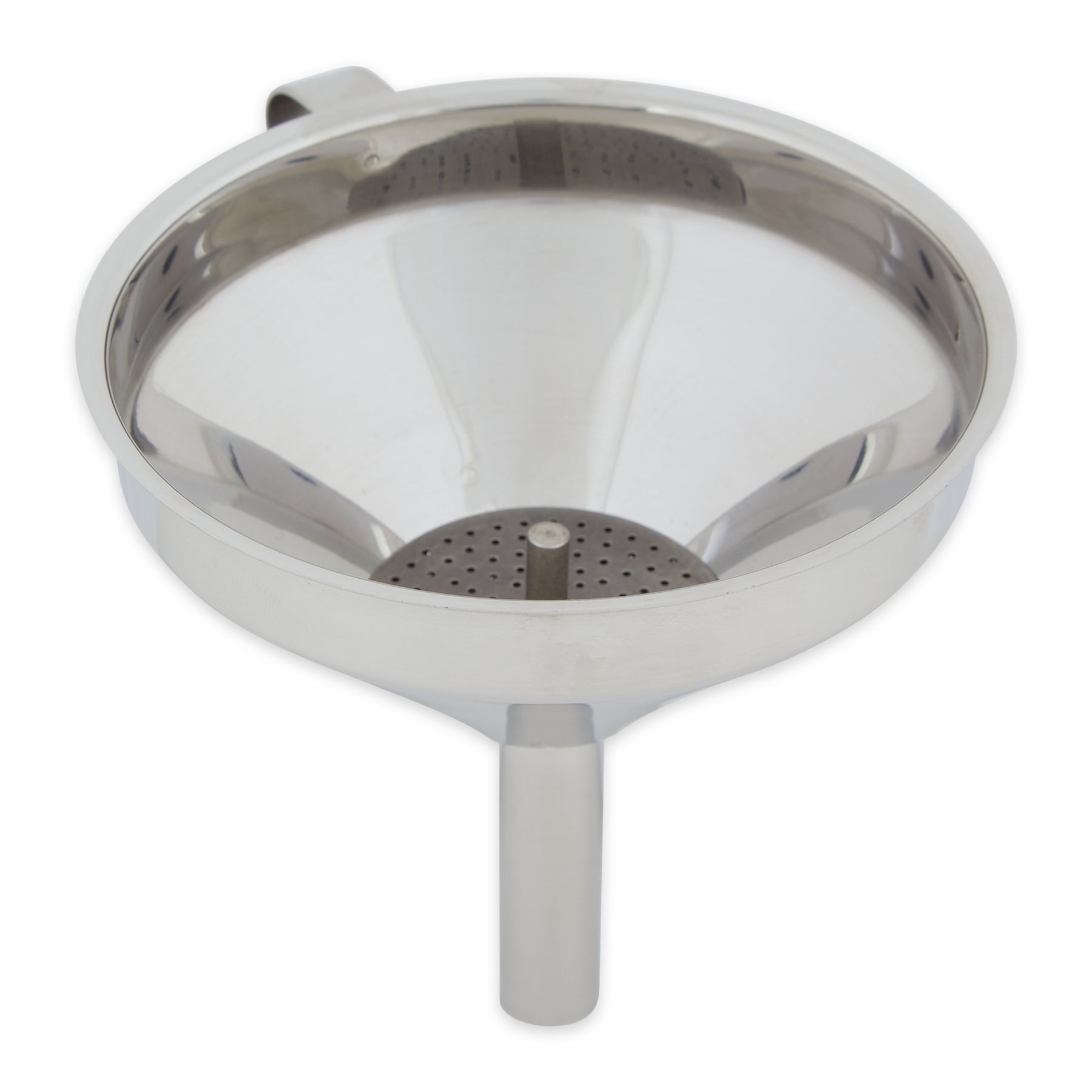 Deluxe stainless steel funnel with removable straining filter for easy cleaning.