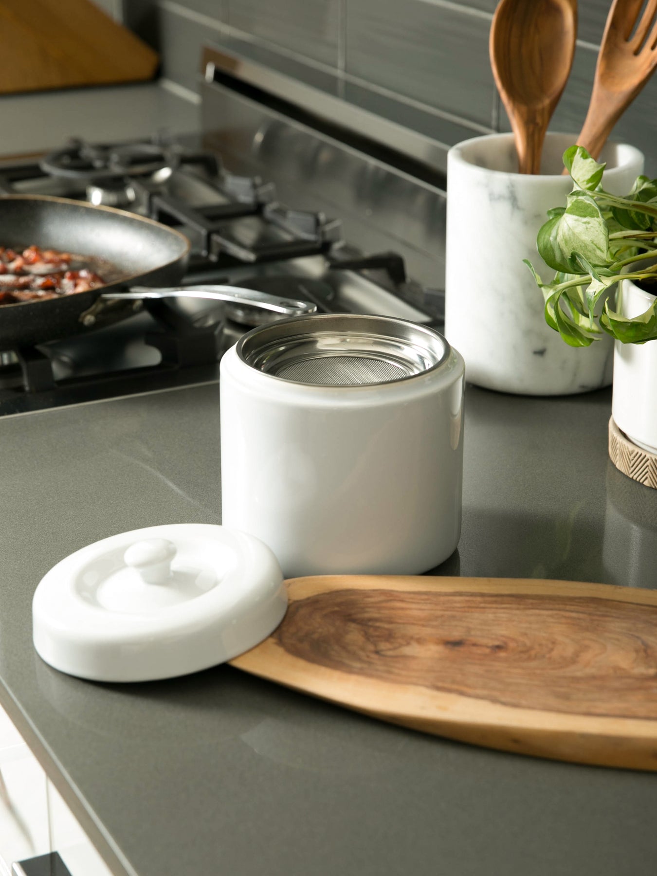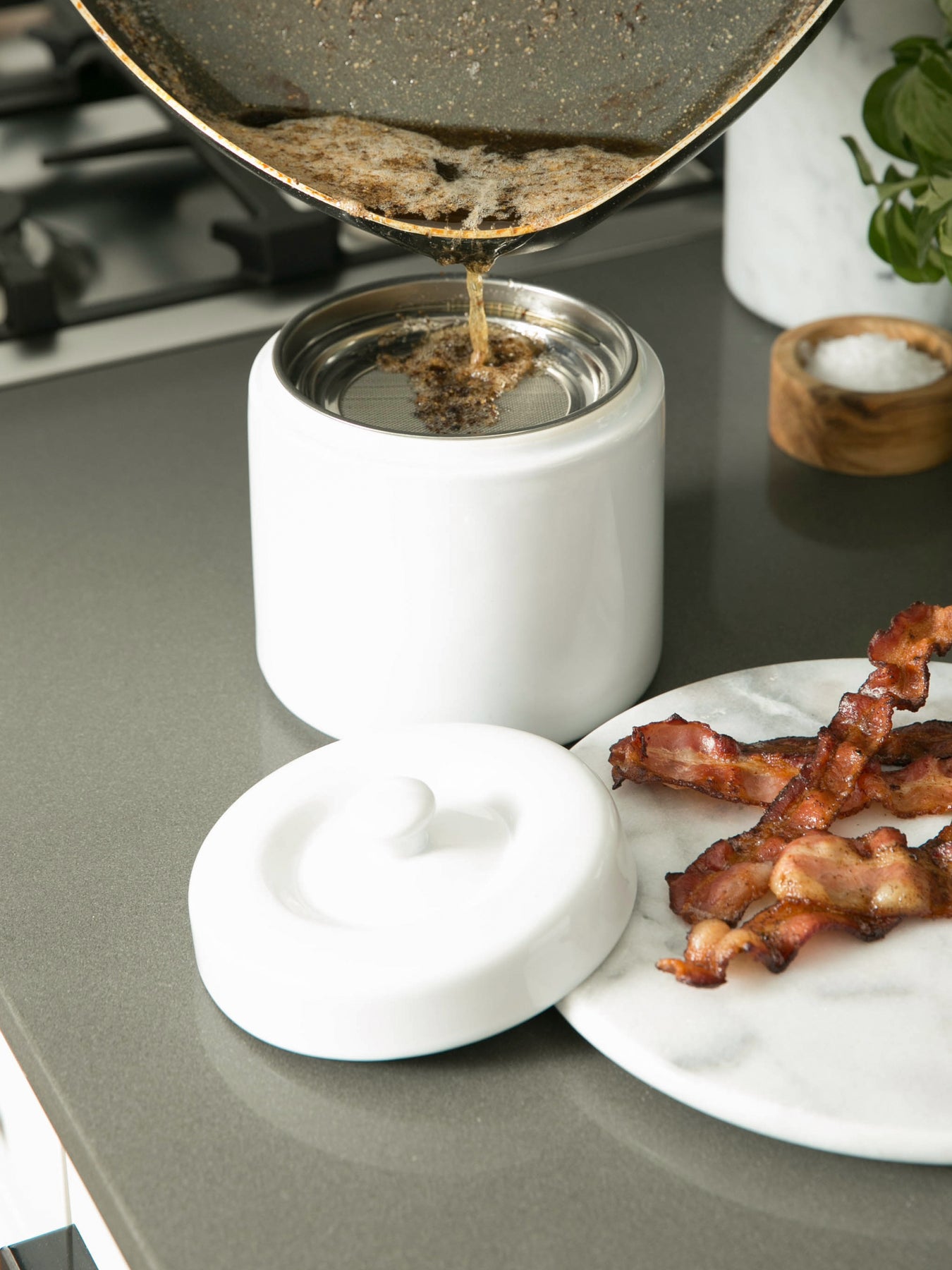 Beautifully designed to keep on your counter to collect cooking oil and grease, while still being an attractive accessory.