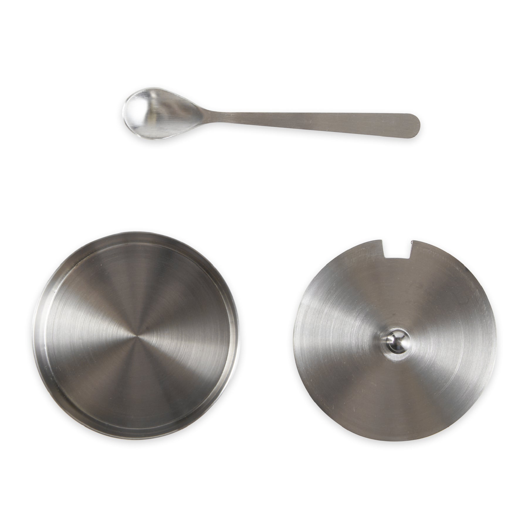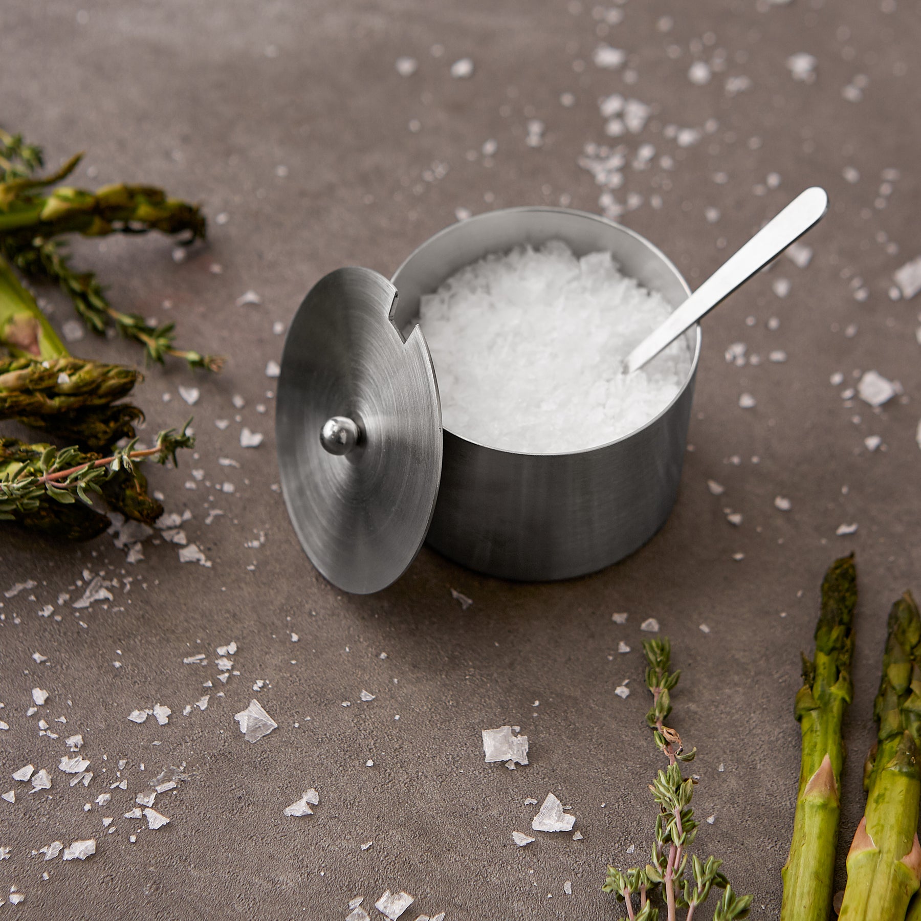 Salt cellar with notch in lid to hold included salt spoon in place.