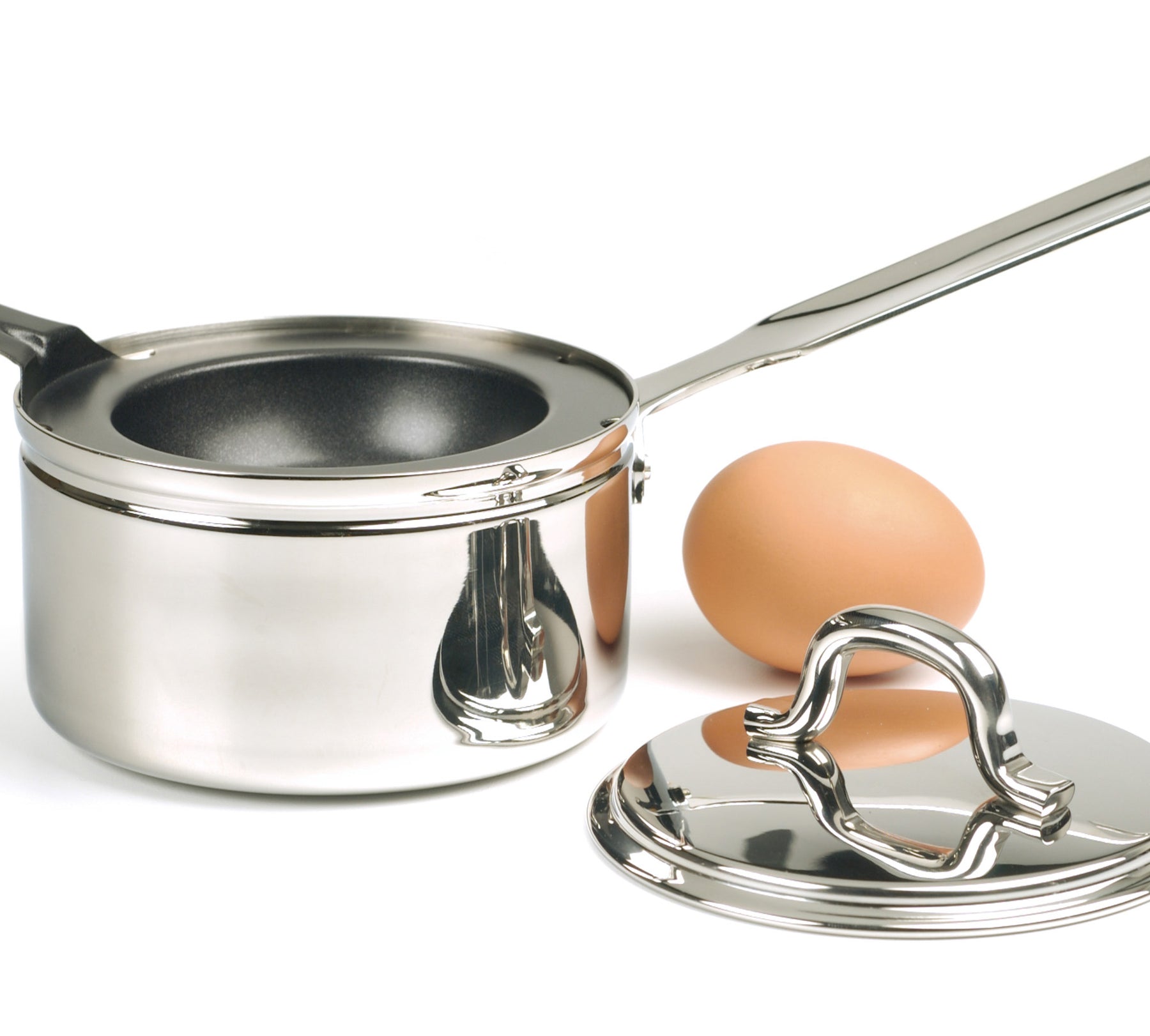 A nonstick poaching insert that cooks one egg at a time, along with a stainless steel pan with a long comfortable handle, and lid.