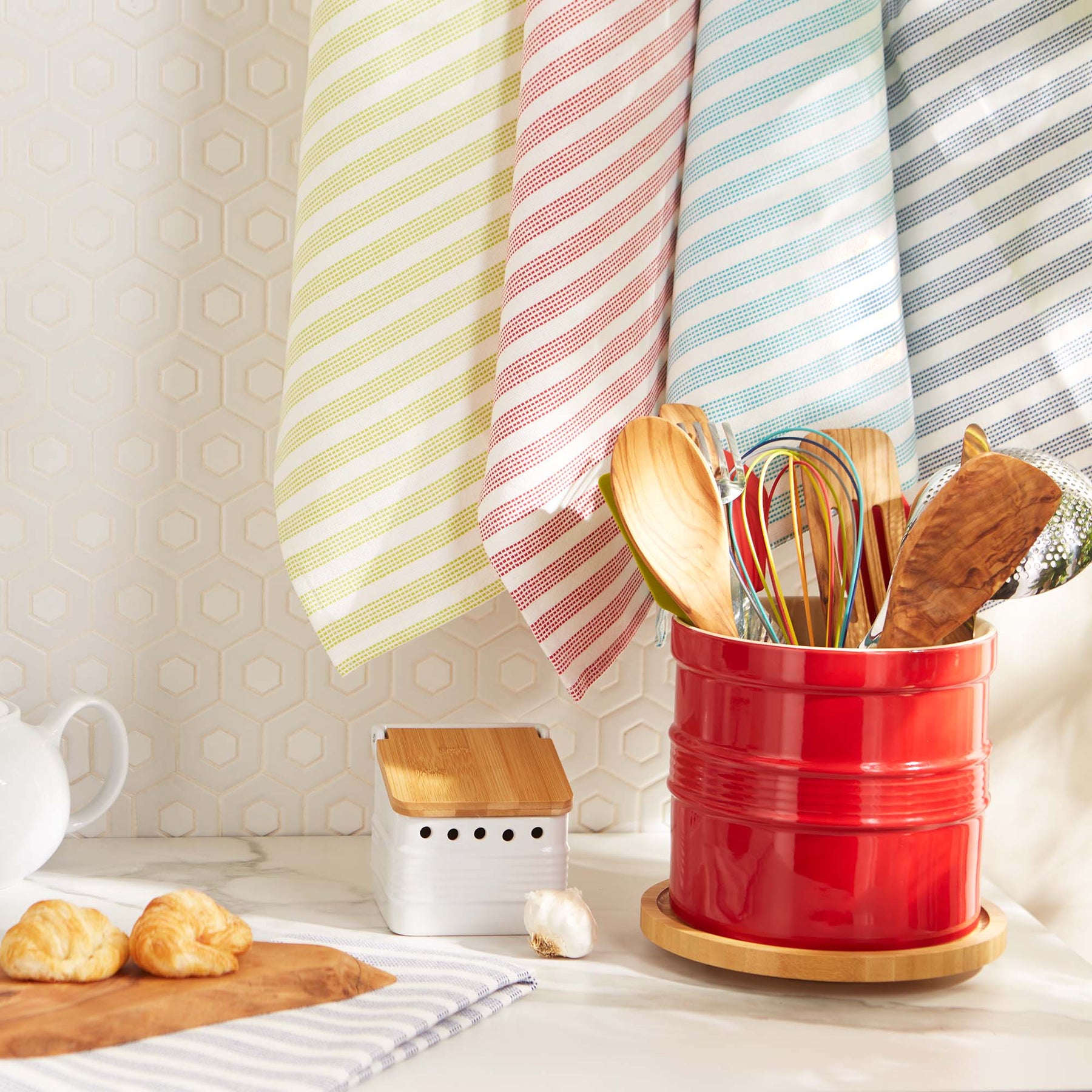 Step up your kitchen linens with our vibrant 3 piece kitchen towel set. These versatile towels will quickly become the towels you turn to for drying dishes, wiping countertops, drying hands and cleaning surfaces.