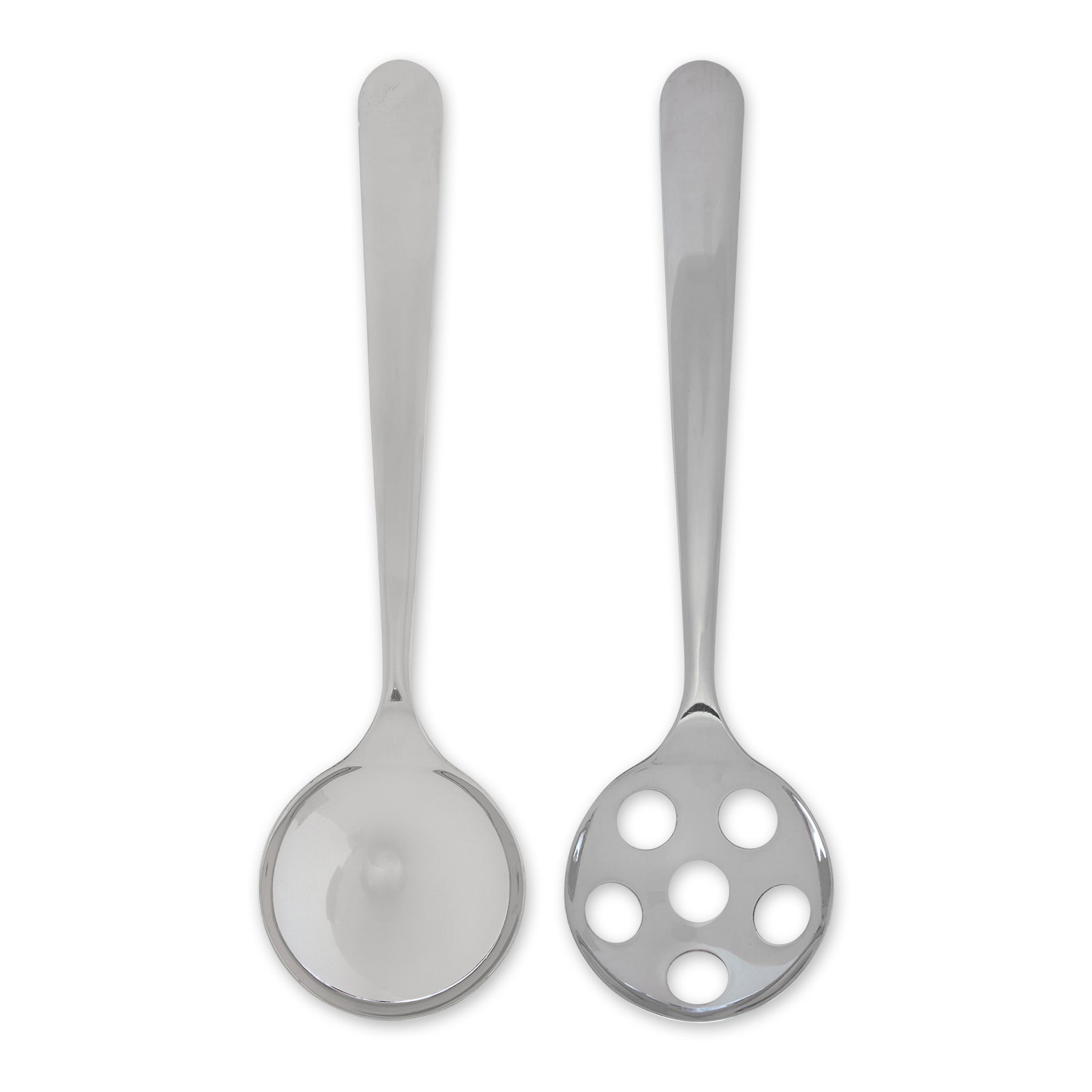 Spoons measure 3.25 inches in diameter, servers measure 11.5 inches in overall length.