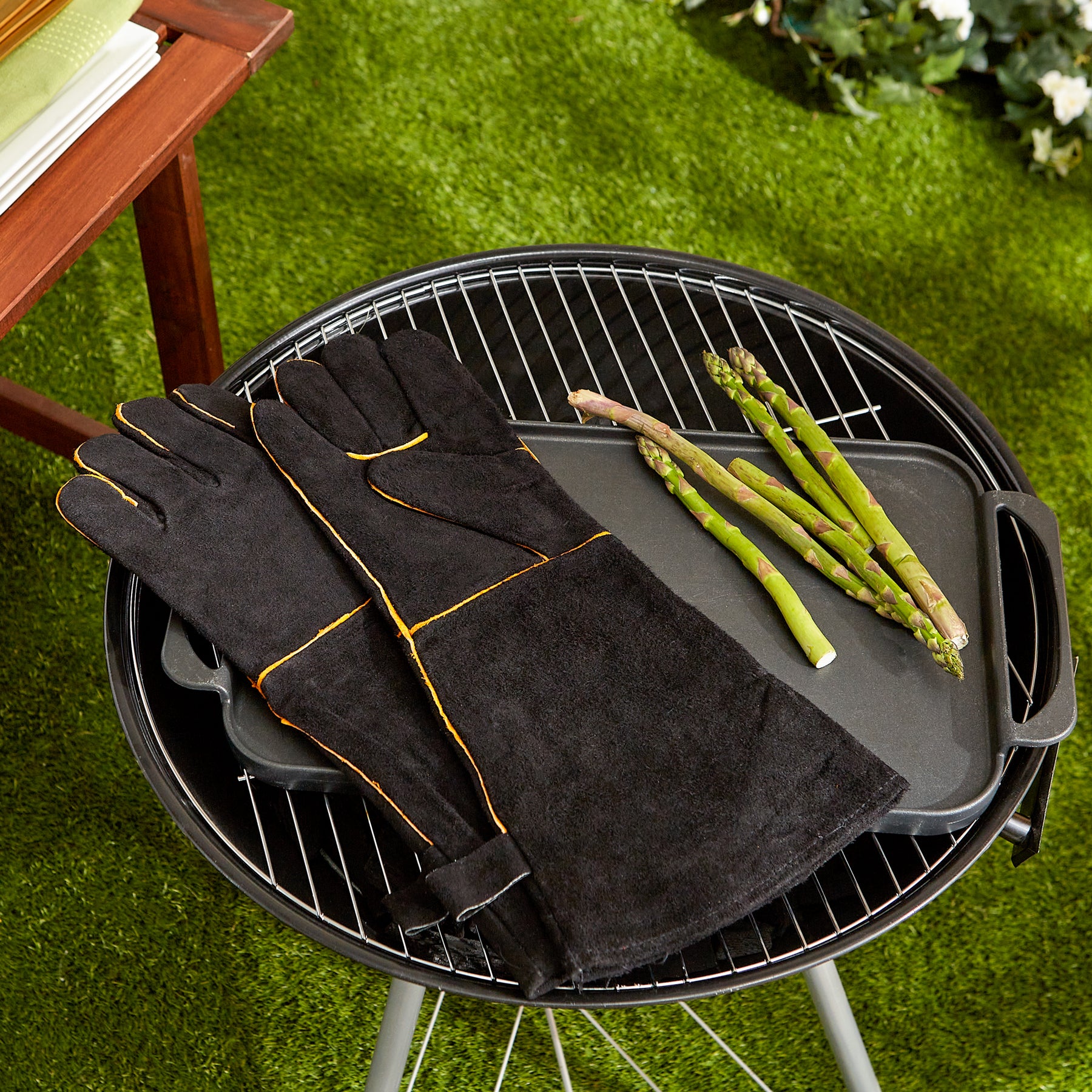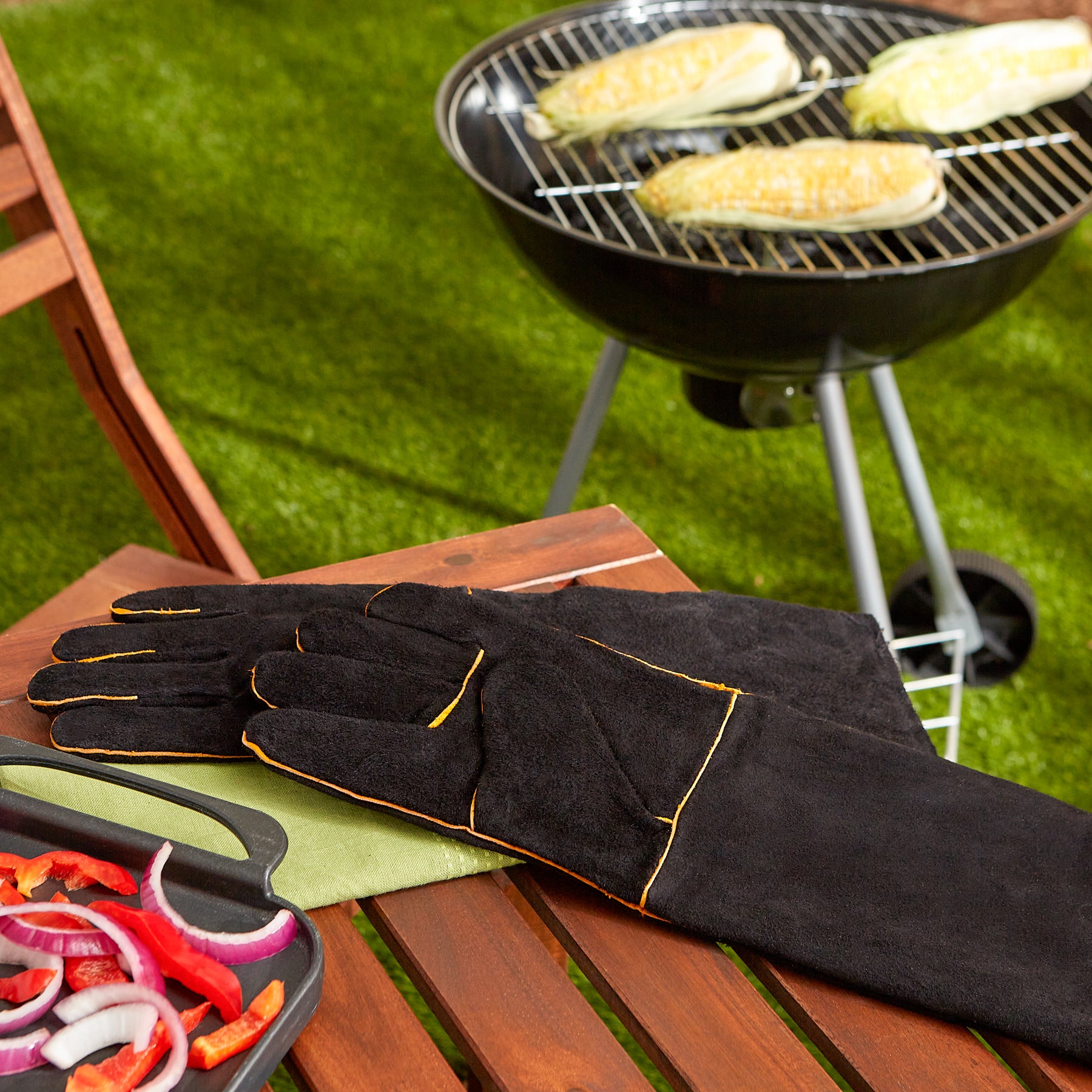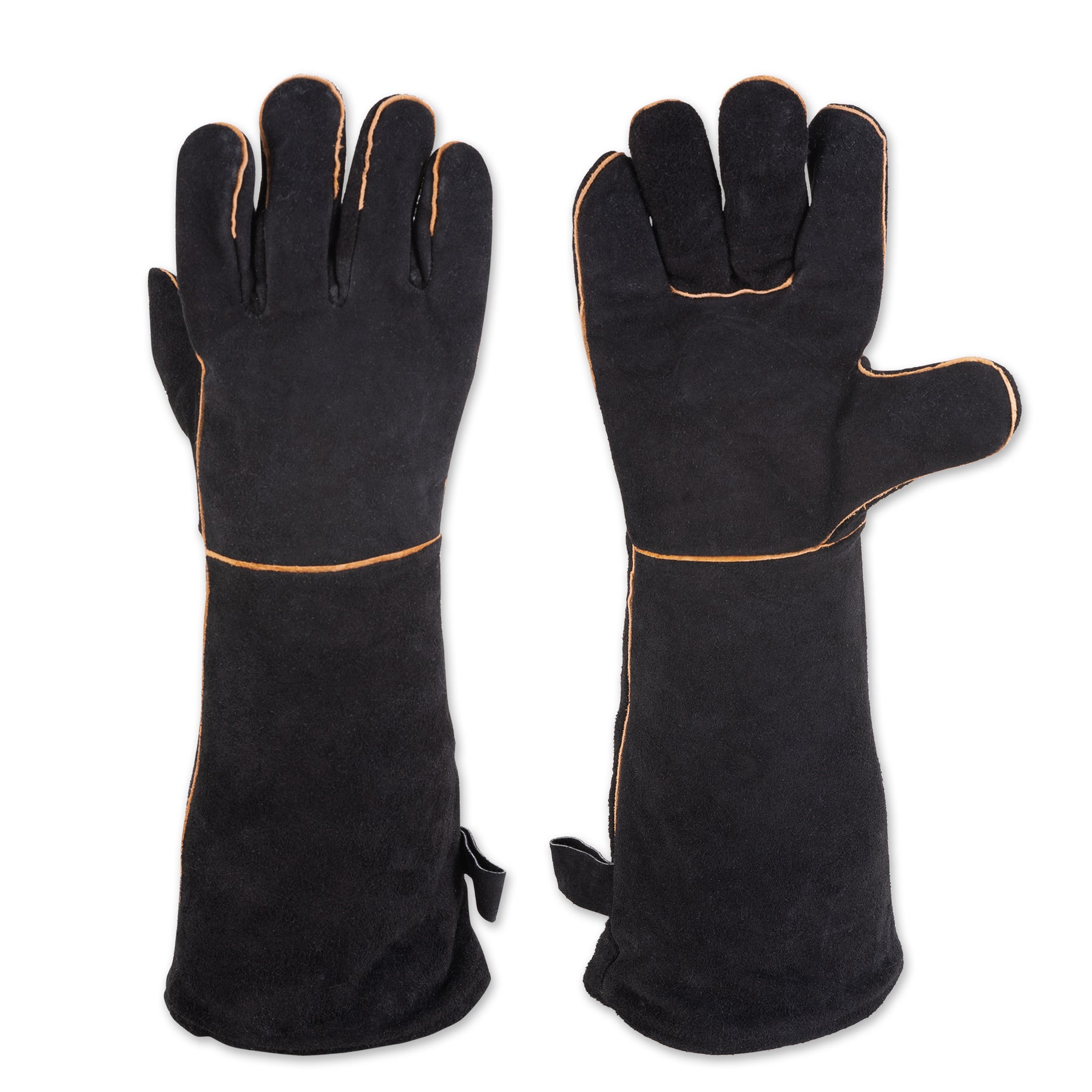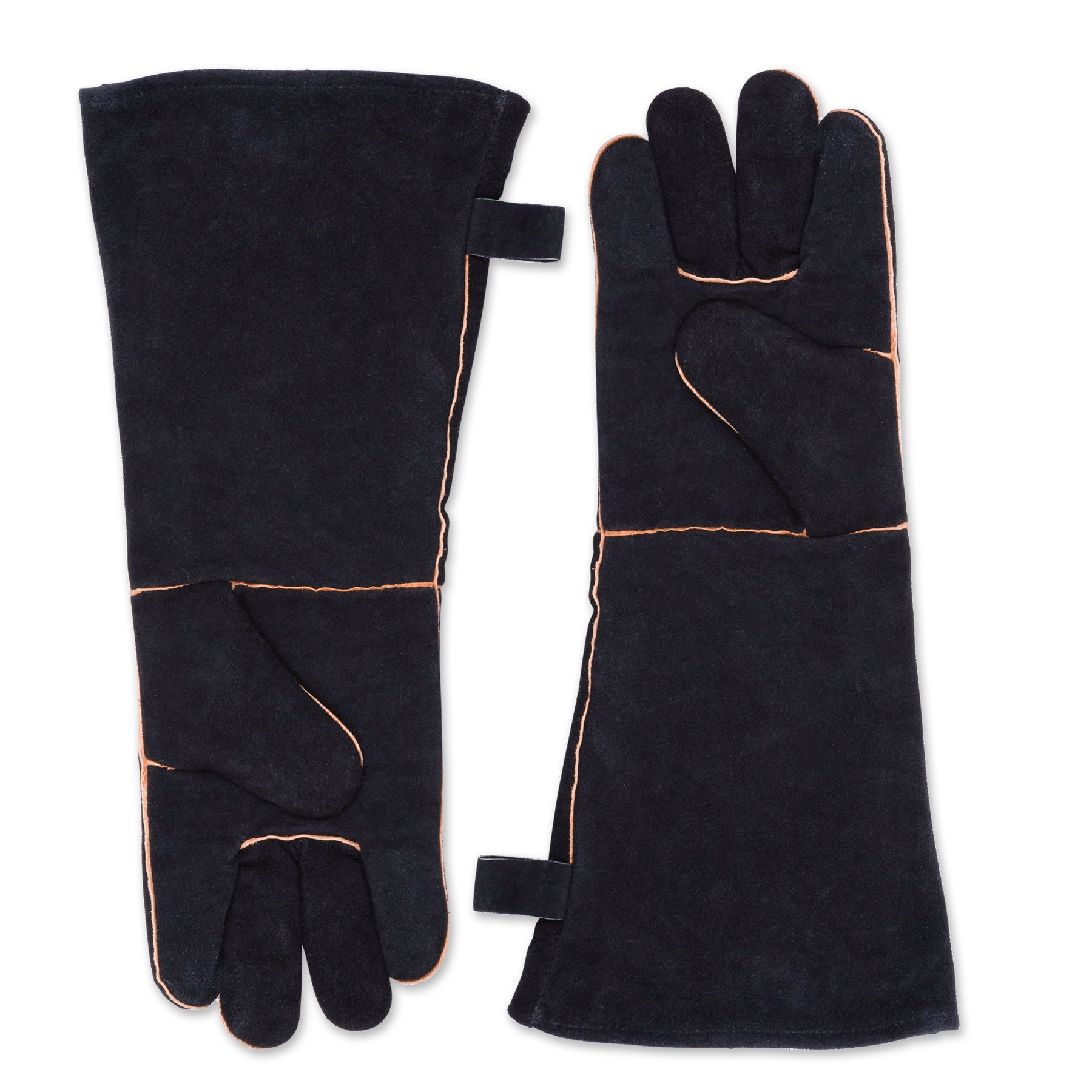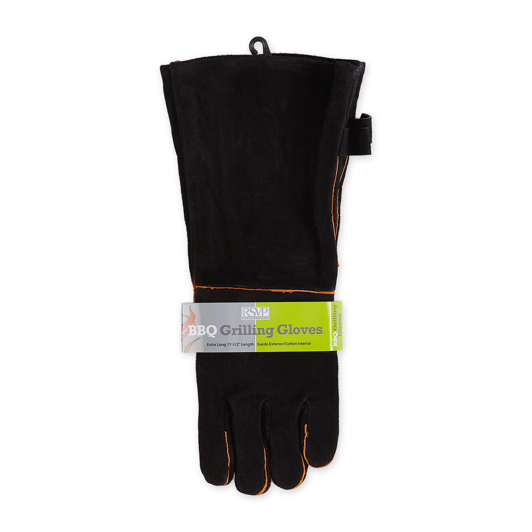Extra-long 17-1/2" black suede grilling gloves protect hands and forearms from heat.