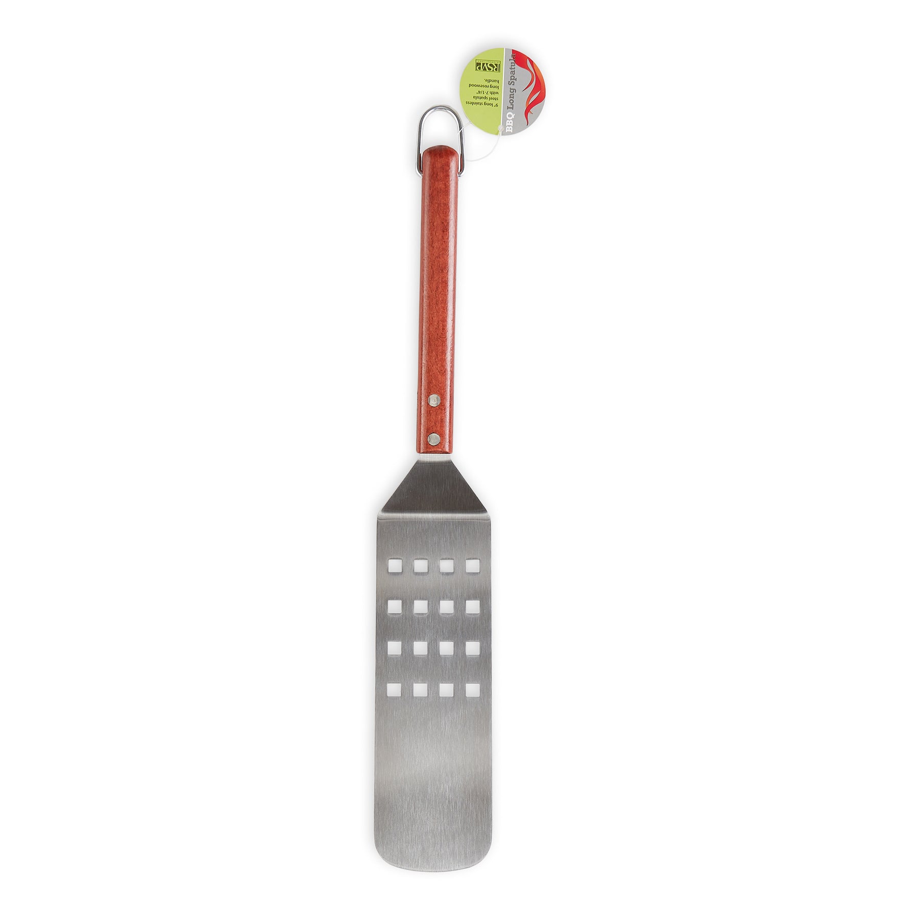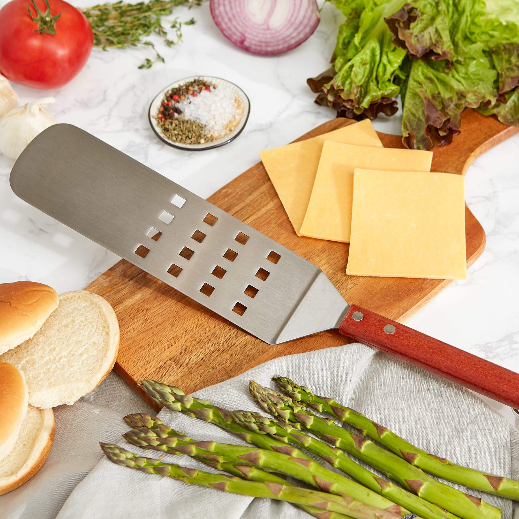 The long handle on our spatula lets you flip burgers and other foods with easy while keeping your hands away from the fire.