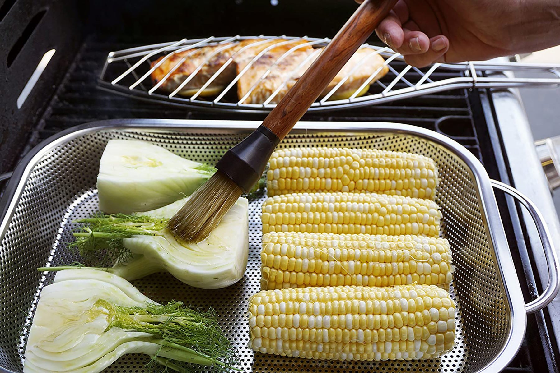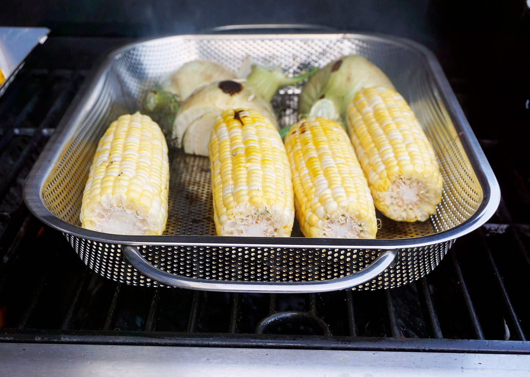 This roasting pan keeps even the smallest pieces in the basket and out of the fire.