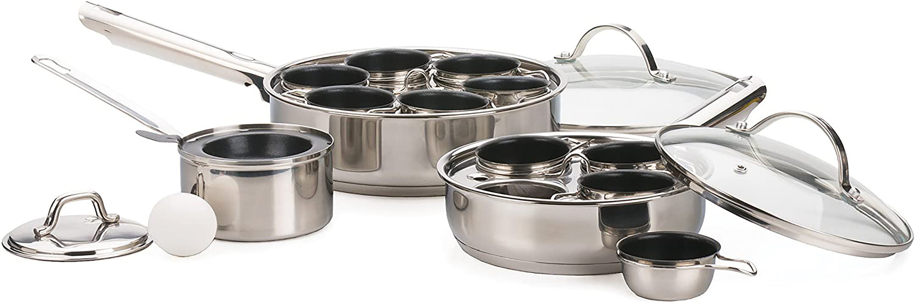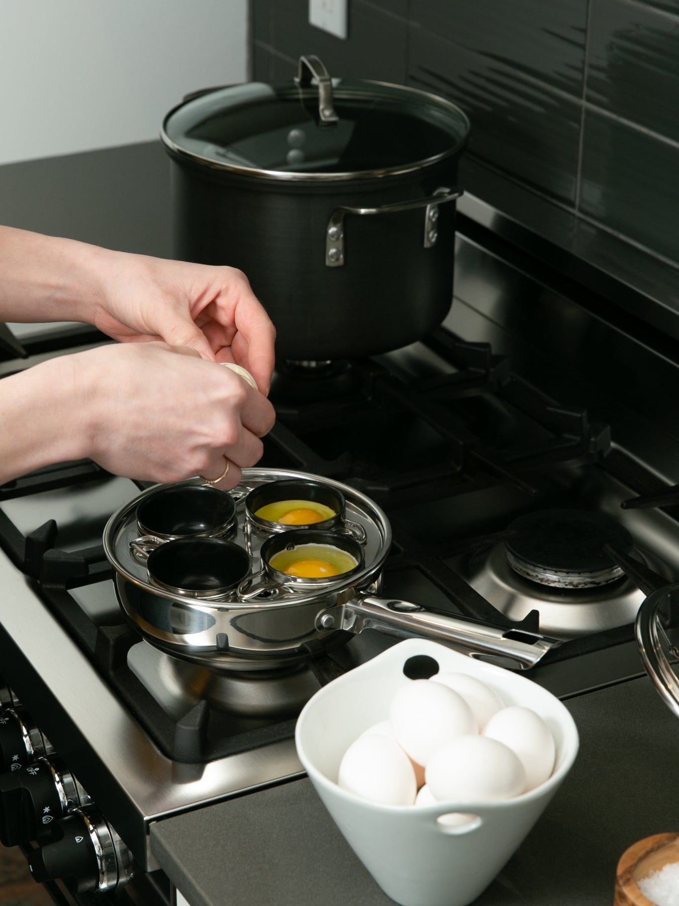 A nonstick poaching insert that cooks one egg at a time, along with a stainless steel pan with a long comfortable handle, and lid.