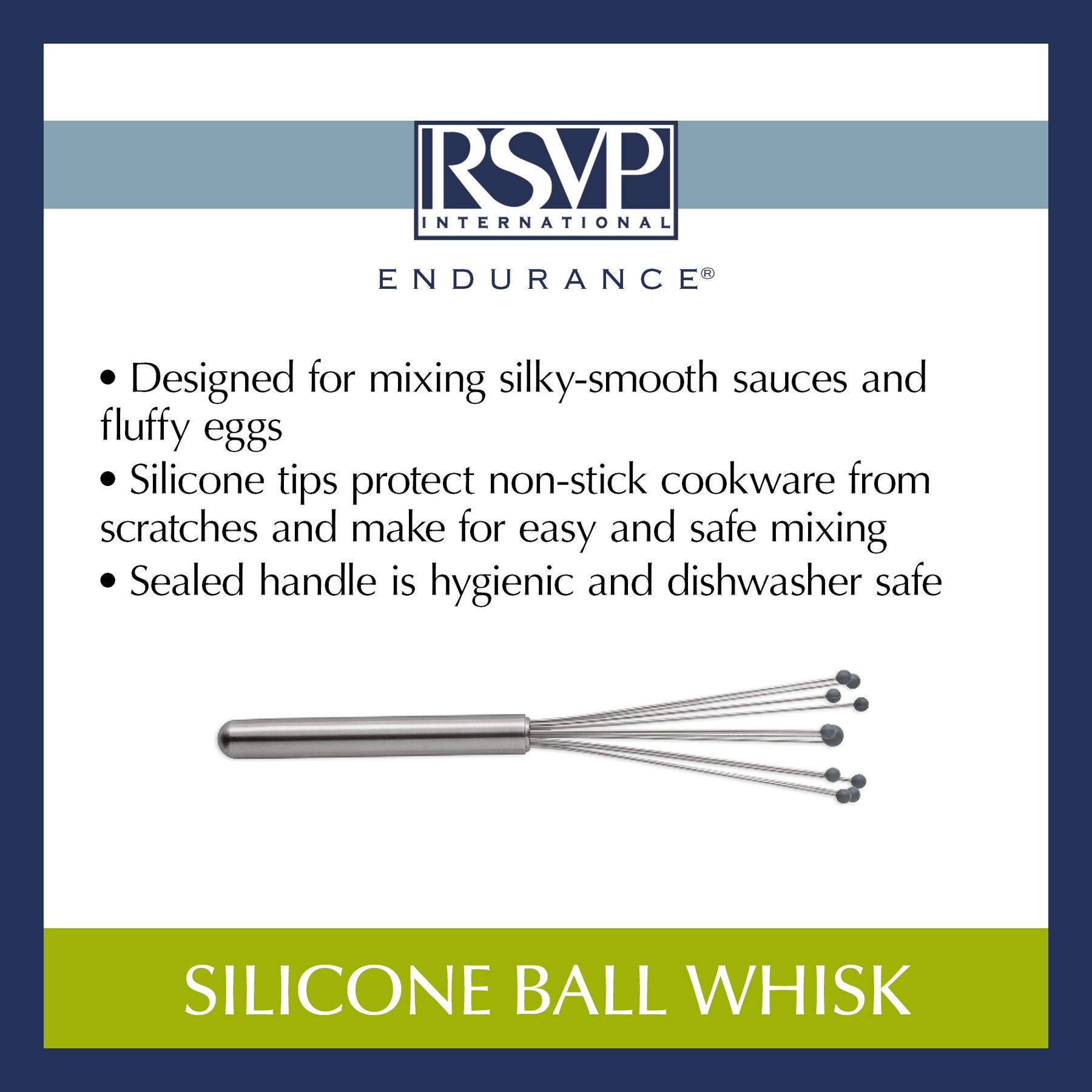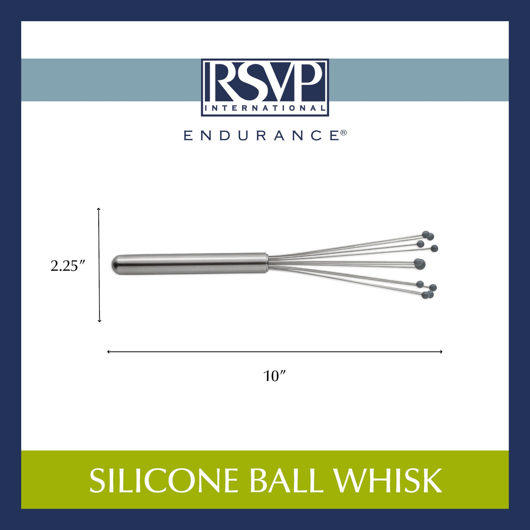 Silicone Ball Whisk measures 10 inches in length with a width of 2.25 inches. Designed with 11 durable 18/8 stainless steel wire tines each tipped with a platinum silicone ball.